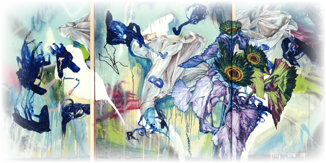 The exhibition is titled Kaleidoscope metaphorically because of the idea that eastern and western cultures can mix together andreflect one another to create wonderful new and harmonious patterns. Also, much like a kaleidoscope, Chris’s work often repeats and reuses images in iterative ways. Here flowers, wings and landscapes are combined and recombined in new paintings, drawings, and prints. The flowers are symbols of growth, the wings represent freedom and transcendence, and the landscapes map physical and mental space. You can see that some of the works completed this year contain the same motifs as works that were completed a decade ago, like a kaleidoscopic dream they present us with surreal variations of forms.